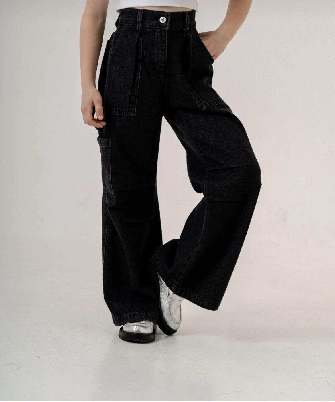 Siyah jean kumaş.Bol paça yanları ceplidir.