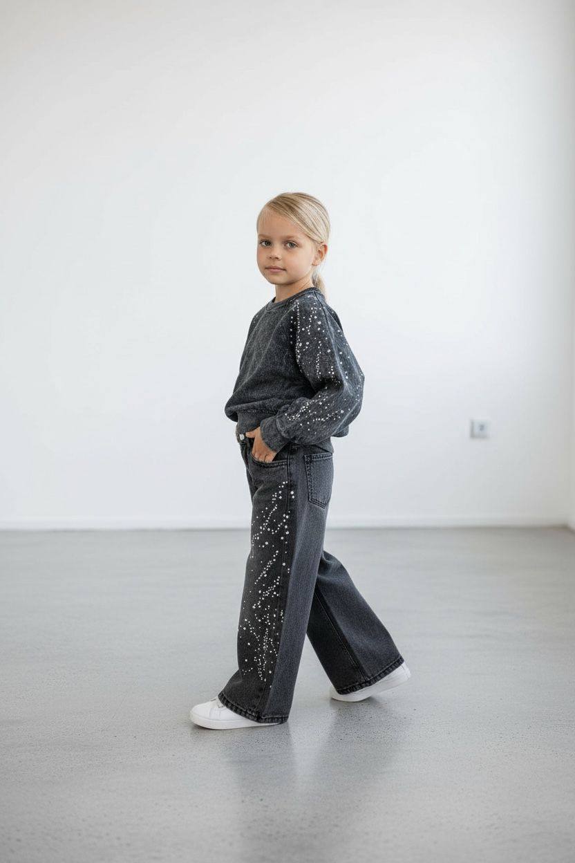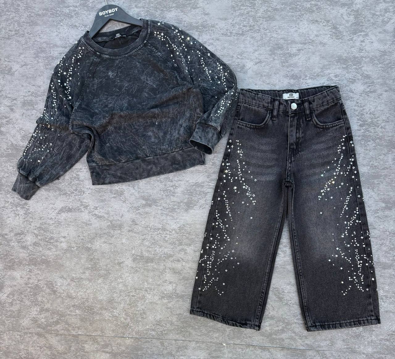 Sweet 3 iplik şardonsuz taş işlemeli.Siyah jean bol paça taş işlemeli.